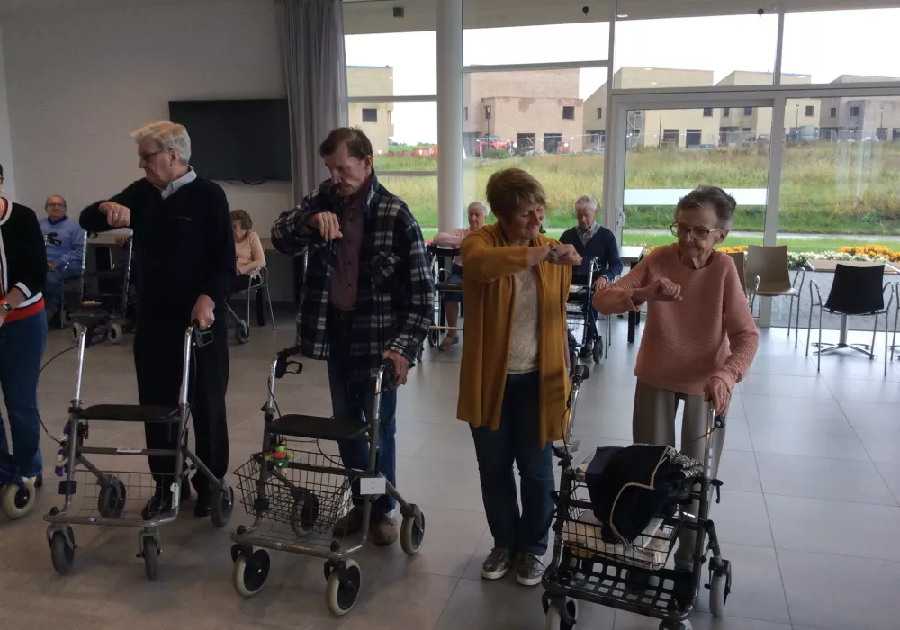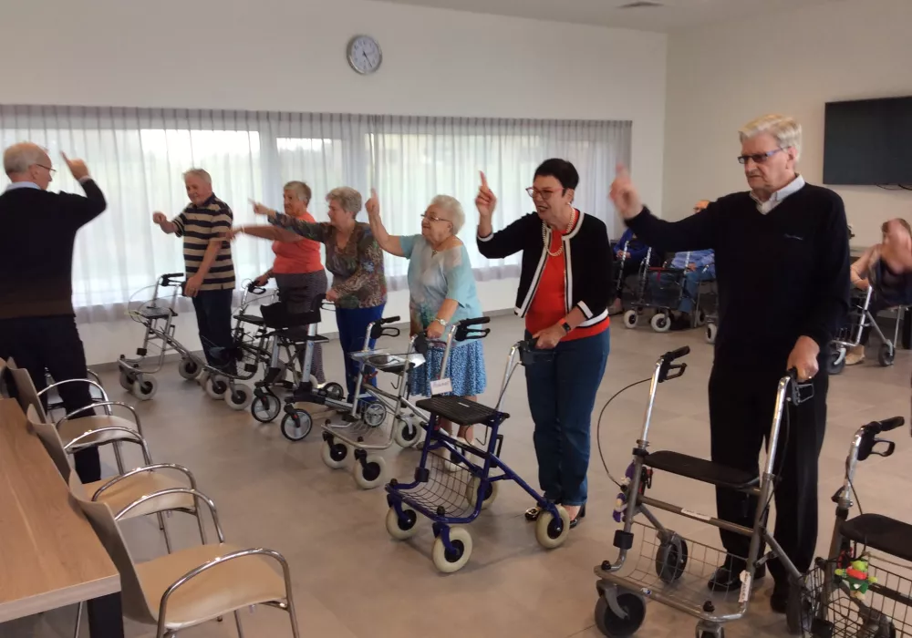 De dienst Kiné met Anneleen en Nico geeft het spreekwoord "rust roest" geen kans. Vrijdag 4 oktober klapten zij samen met onze bewoners de rollators uit en maakten we de dansvloer onveilig!