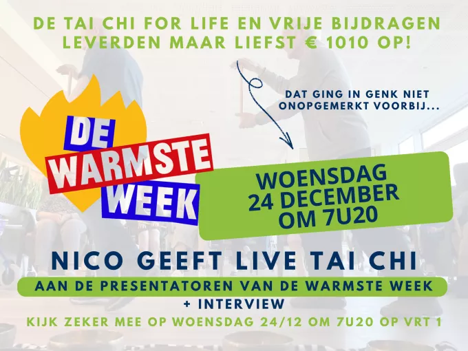 Op 24/12 om 7u20 geeft hij, naast een interview, live tai chi voor de presentatoren van De Warmste Week! Een mooi moment van verbinding, rust en solidariteit waar iedereen van OLV Ter Veldbloemen erg trots op is.